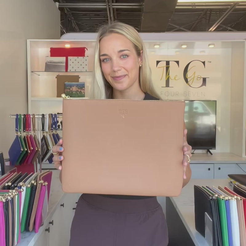 Size #8 Tan is the ultimate versatile organizer with sleek design and spacious interior that makes it a must-have for anyone on-the-go. Use it to pack notepads, small computer, iPad, a change of clothes, sports equipment, toiletries, or even shoes.